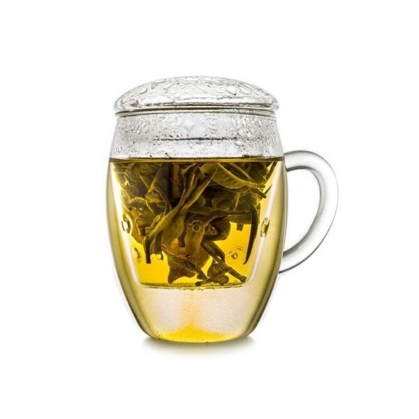 Tento pohár je ideálny na prípravu sypaných a kvitnúcich čajov. Sklenené sitko zabezpečuje, že čajové lístky zostanú oddelené od nápoja, zatiaľ čo sklenené viečko pomáha udržať teplotu a zároveň slúži ako podložka pre sitko po lúhovaní.